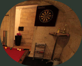 Willkommen in unserem einzigartigen Sandsteingewölbe im Kellerbereich unseres Hauses. Sollten Sie den Tag oder Abend in unserem Haus verbringen wollen, es Ihnen auf unseren Terassen oder auf der Couch zu langweilig sein, so bieten wir Ihnen, natürlich kostenlos, die Möglichkeit, sich bei folgenden Aktivitäten die Zeit zu vertreiben:* Tischkicker *Dart* Kinderunterhaltung :-)*Billard